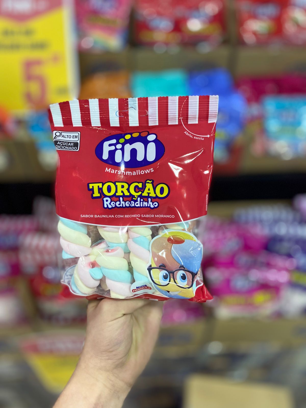 Marshmallow fini torção sabor baunilha com recheio de morango 80g