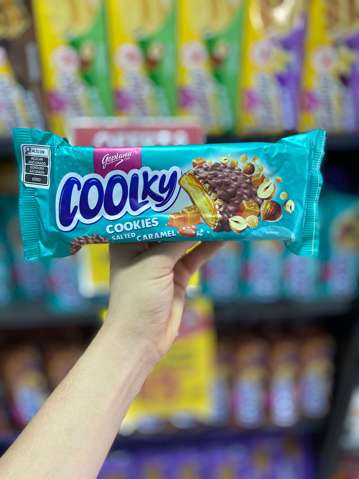 Biscoito Cookies coberto com chocolate ao leite com recheio de creme de caramelo salgado, avelas e flocos
