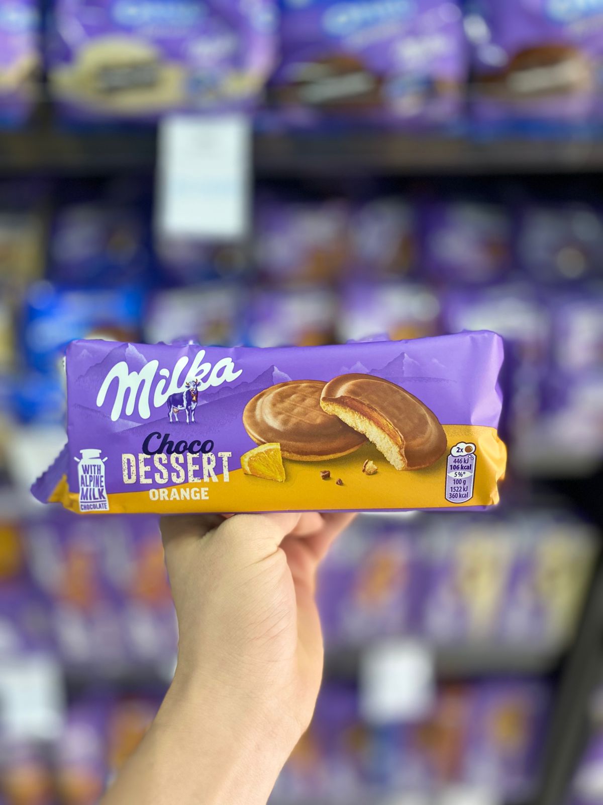 Bolihnos macios com recheio de geleia de laranja e cobertura de chocolate ao leite milka 147g