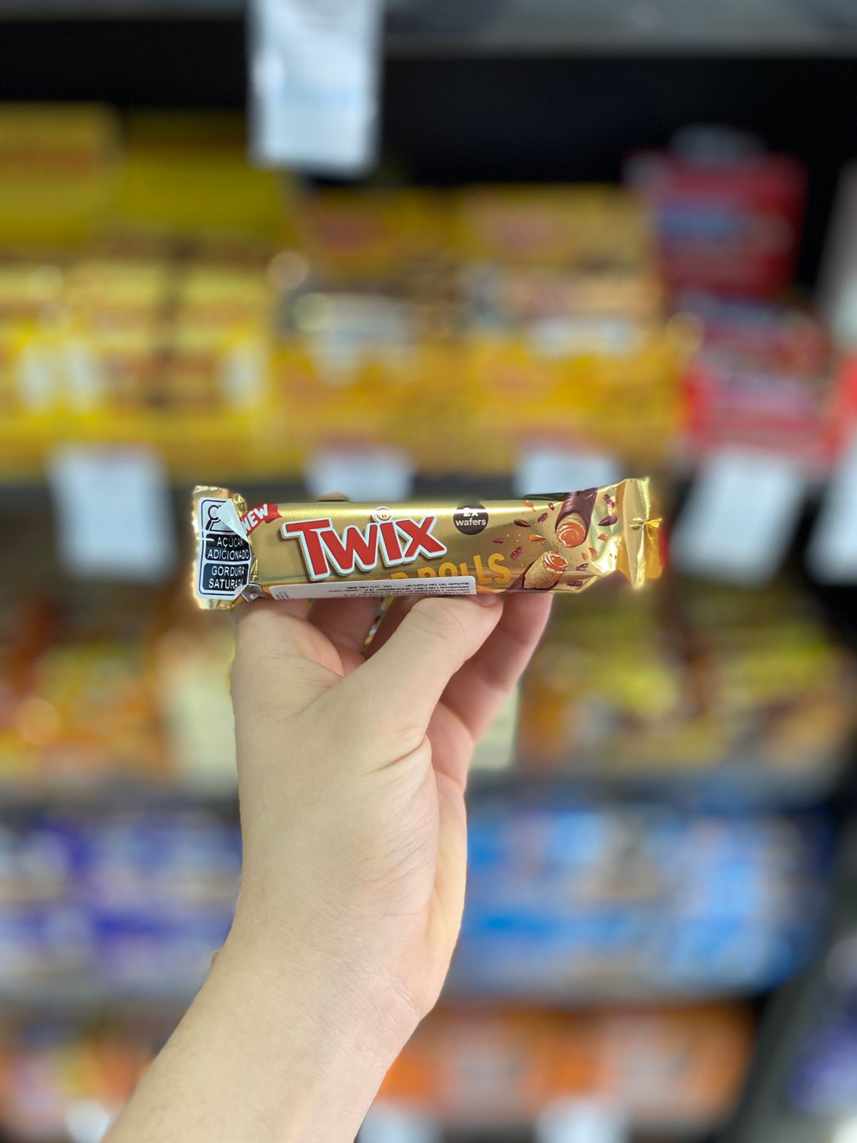 2 rolinhos de wafer com recheio de caramelo e cobertura de chocolate ao leite Twix.