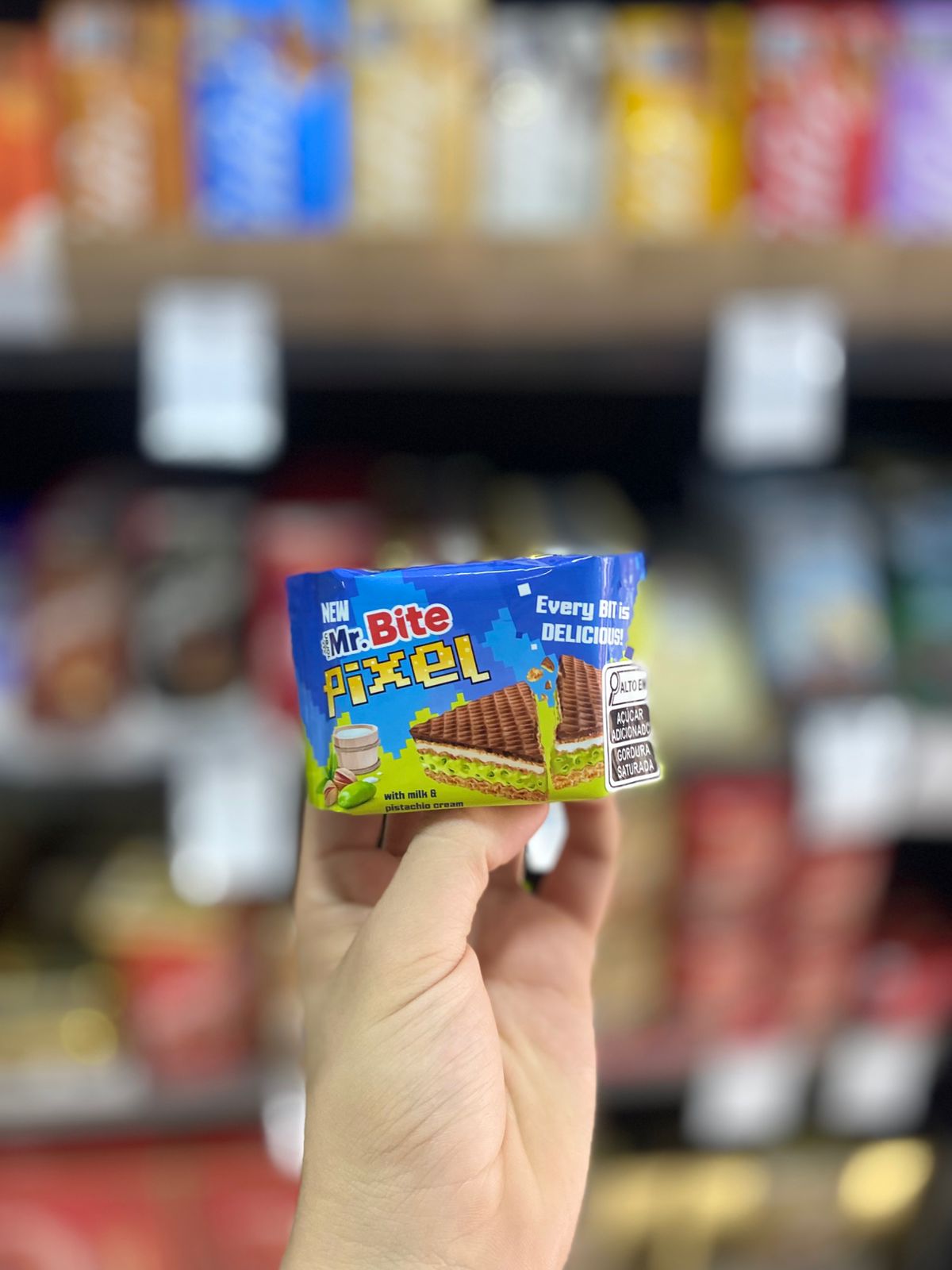 Chocolate Importado Mr Bite Pixel É Uma Wafer Com Recheio De Pistache, leite E acaoberta Com Chocolate