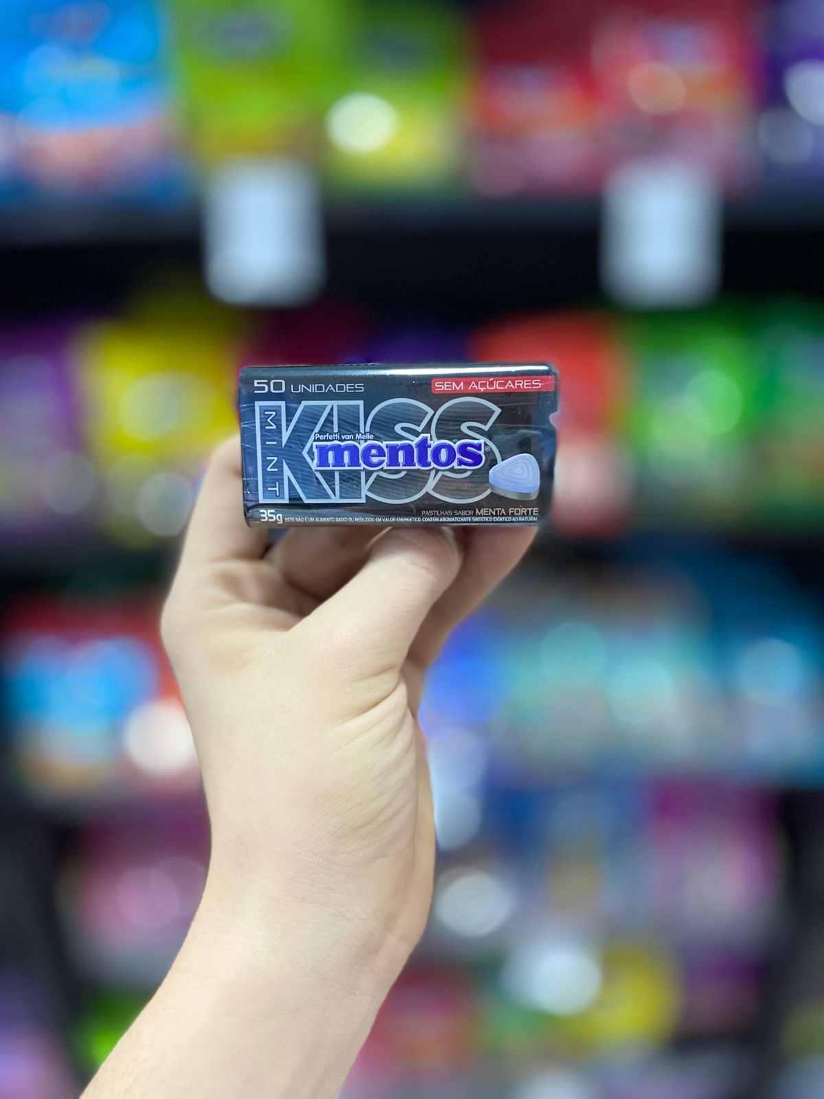 Caixinha de metal com 50 unidades de bala mentos extra forte kiss